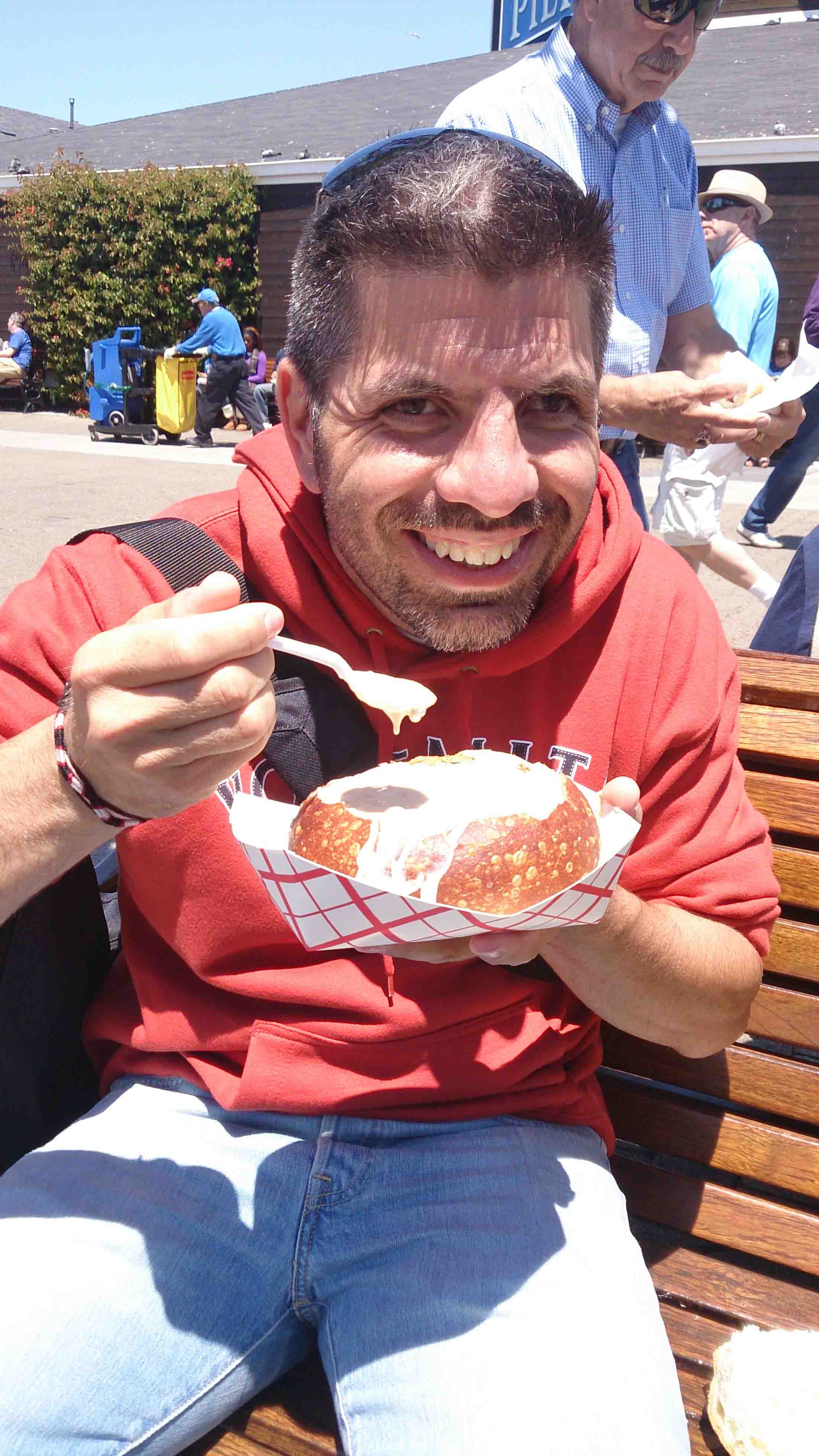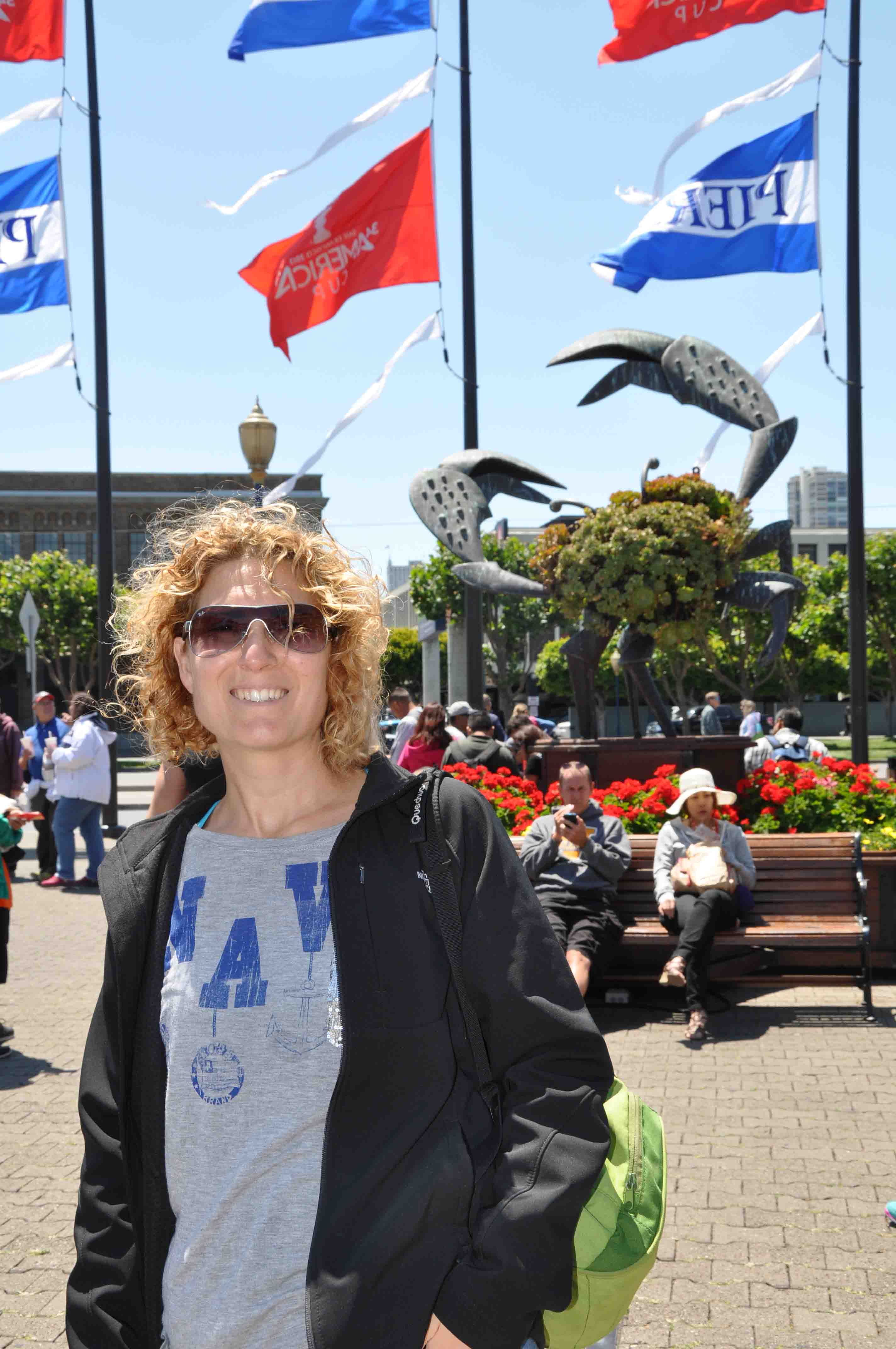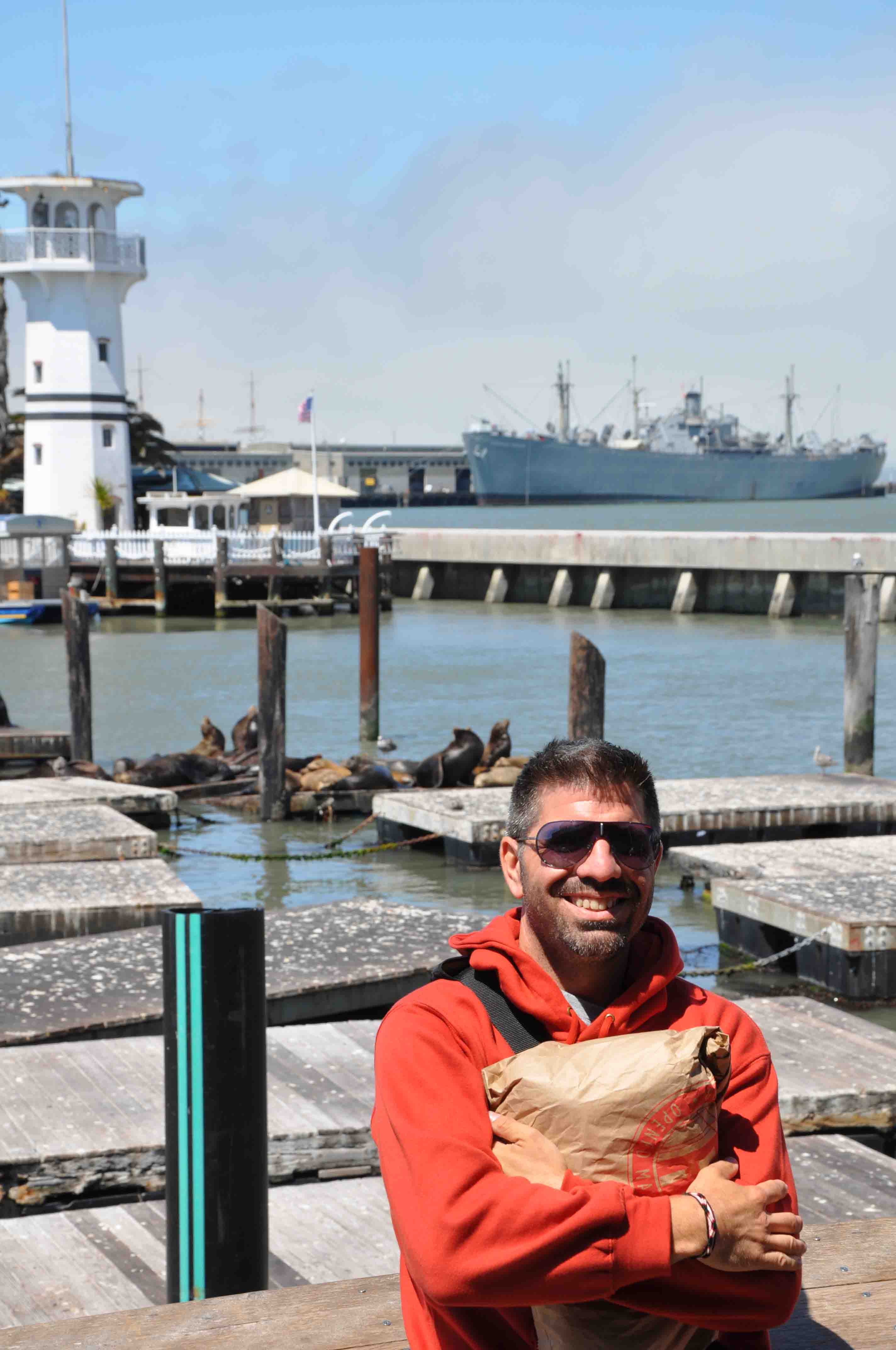 Para terminar, nos tomamos algo en una pequeña cafetería que hay al lado mientras venia el autobús de vuelta. Ya de vuelta paramos en Fisherman´s Wharf, la zona vieja del puerto de San Francisco, un lugar bastante turístico que aún conserva cierta autenticidad. Allí fuimos al Pier ( muelle) 39, el lugar más conocido de Fisherman’s Wharf ya que en él se encontraba uno de los mayores atractivos para los visitantes, decenas de leones marinos que retozaban y tomaban el sol mientras emitían sus especiales gruñidos que se dejaban oír desde una gran distancia. El muelle 39 encontramos gran cantidad de tiendas y restaurantes distribuidos en dos plantas. Nos gusto mucho toda la zona y nos quedamos por allí para comer. Comimos lo más recomendable, unos cócteles de cangrejo que preparaban en uno de los puestos callejeros que por el muelle había.