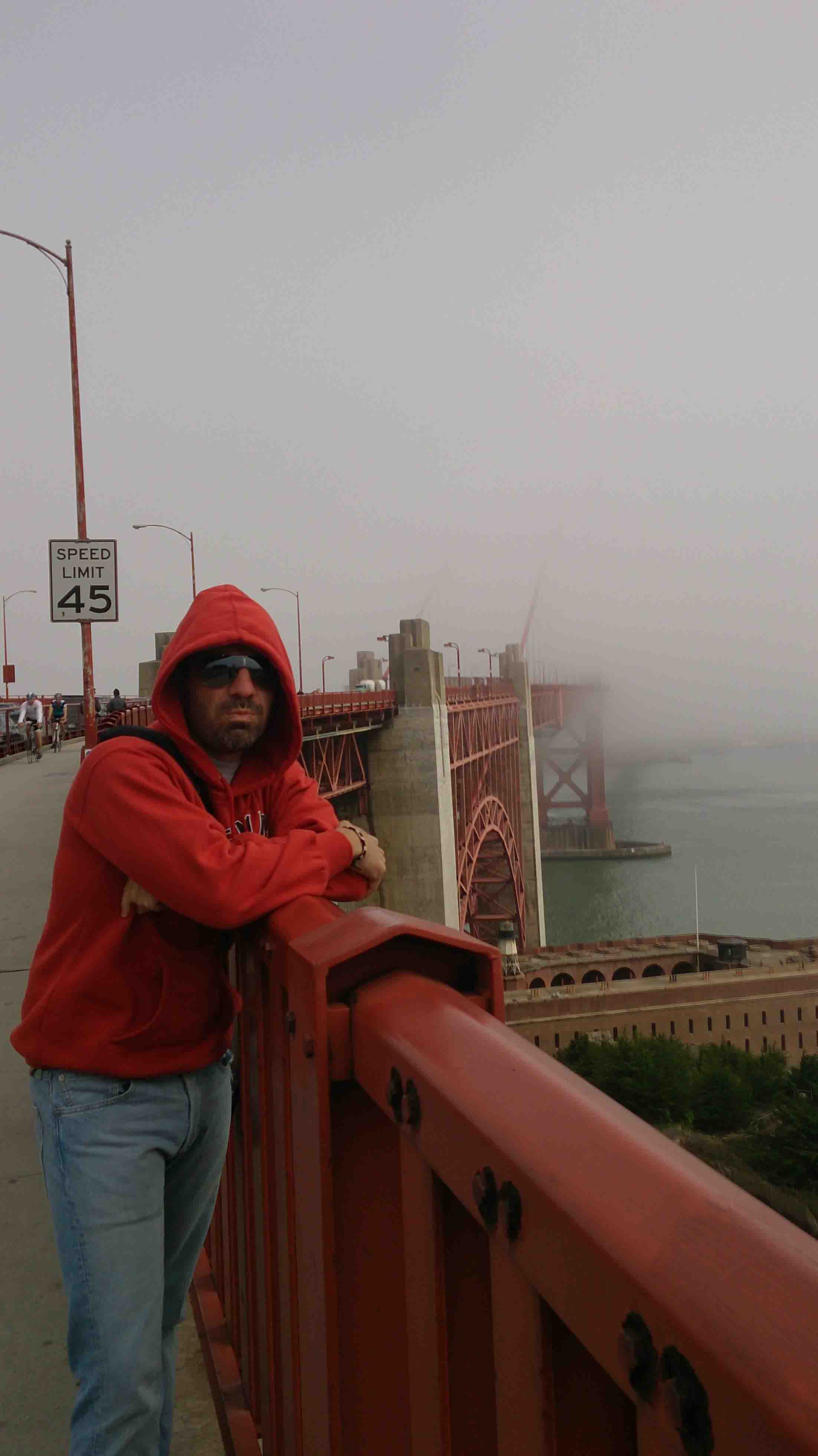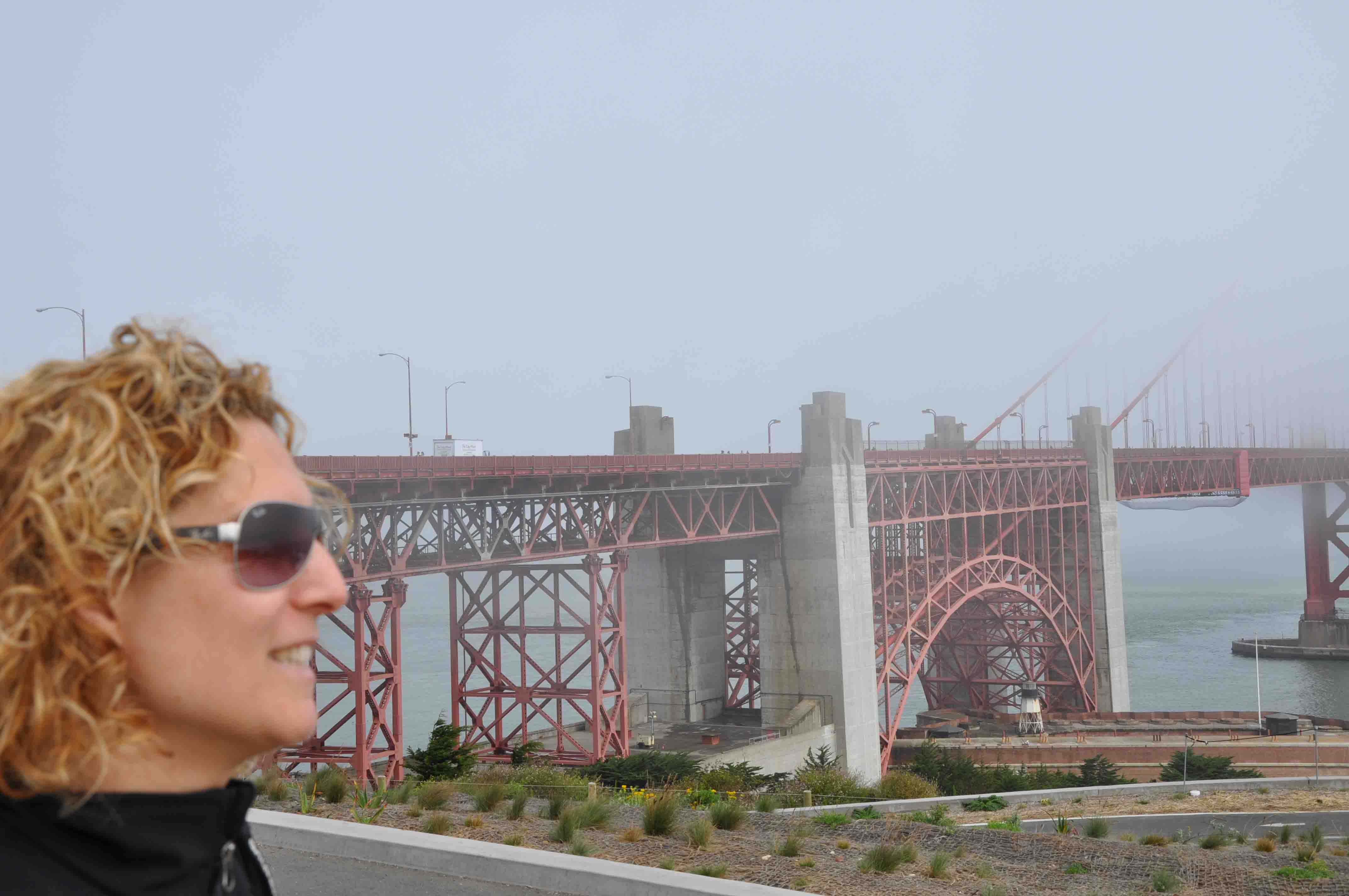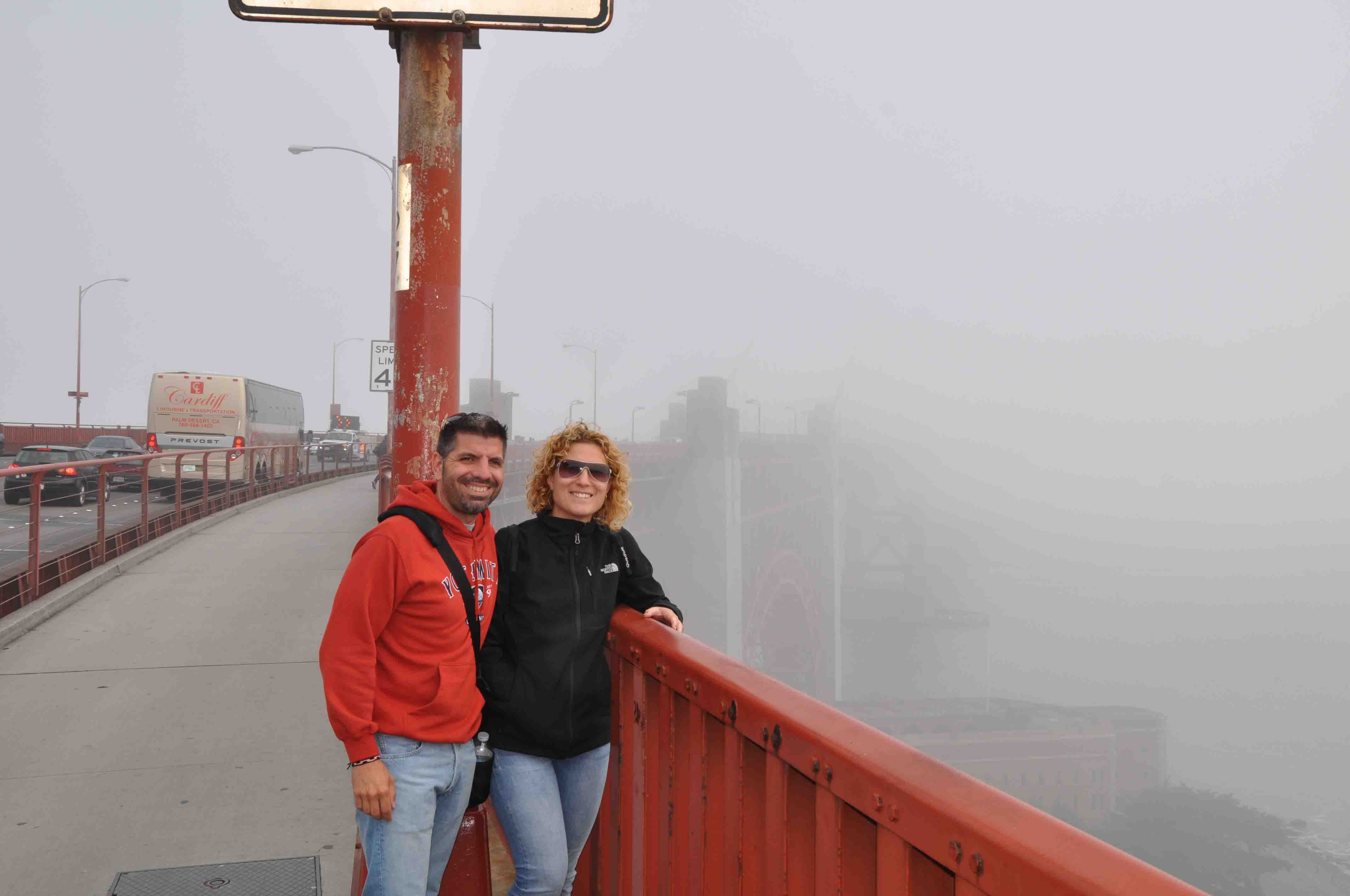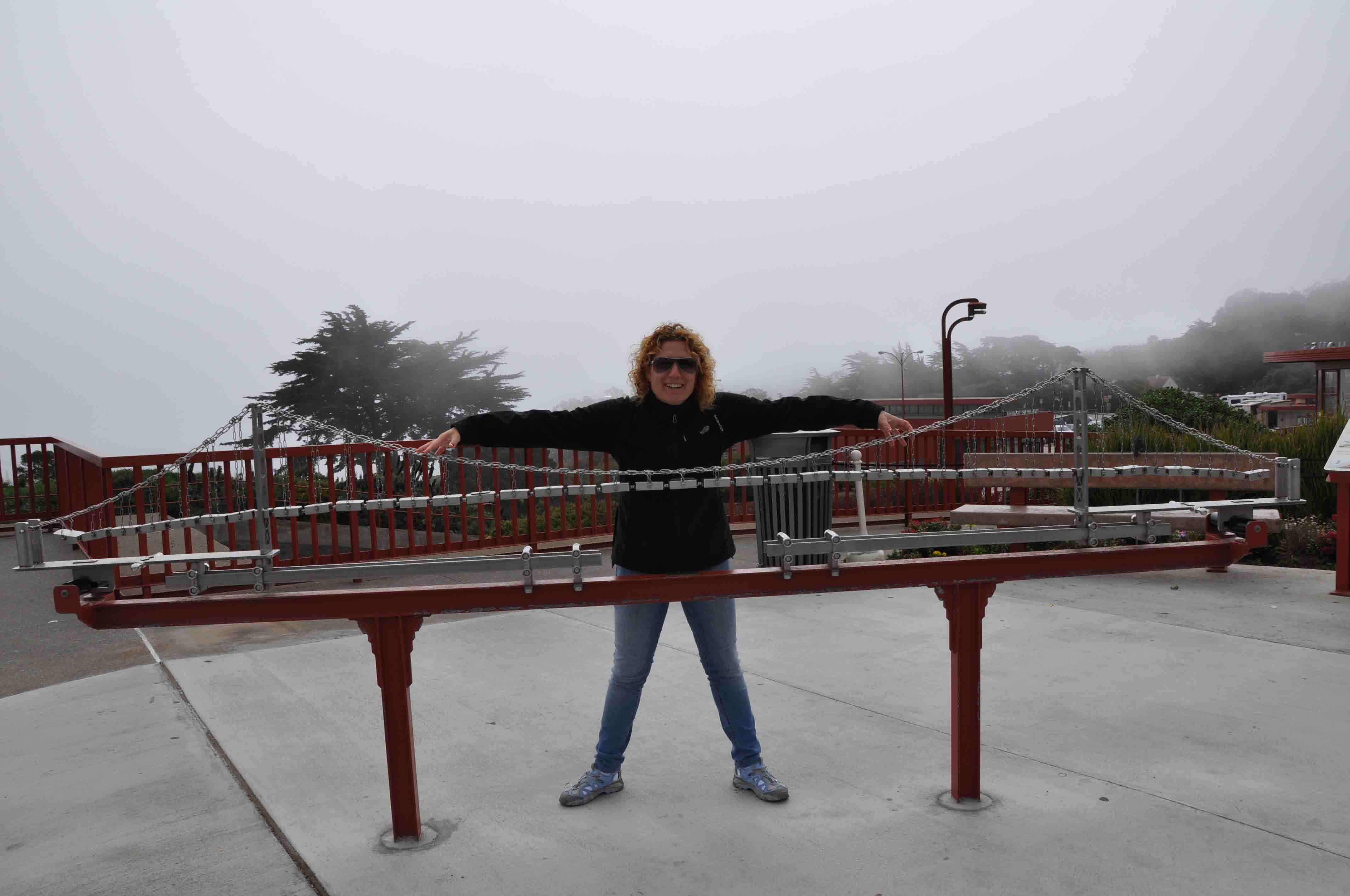 colgantes más largos y altos del mundo y, sobre todo, es el símbolo más querido y representativo de la ciudad de San Francisco. El autobs nos dejo en el Golden Gate Bridge Pavilion donde pudimos ver fotos de la construcción, incluso varias maquetas y muchos datos de la construcción de este fantástico puente. Luego salimos a dar una vuelta por el puente. Estuvimos paseando unos cientos de metros pero como había niebla tuvimos que darnos la vuelta. Tienes que tener suerte para coger un dia despejado y ver el puente en su totalidad, a nosotros nos toco verlo solo a medias.