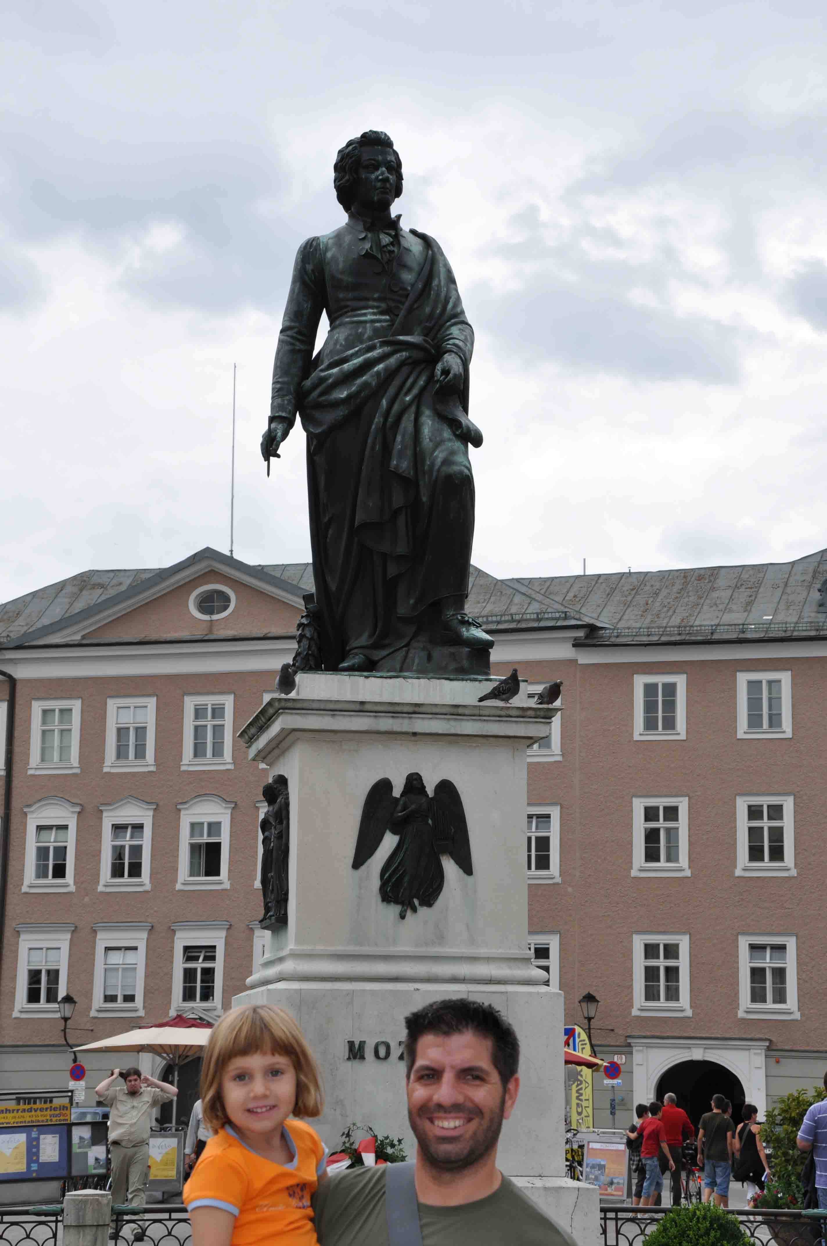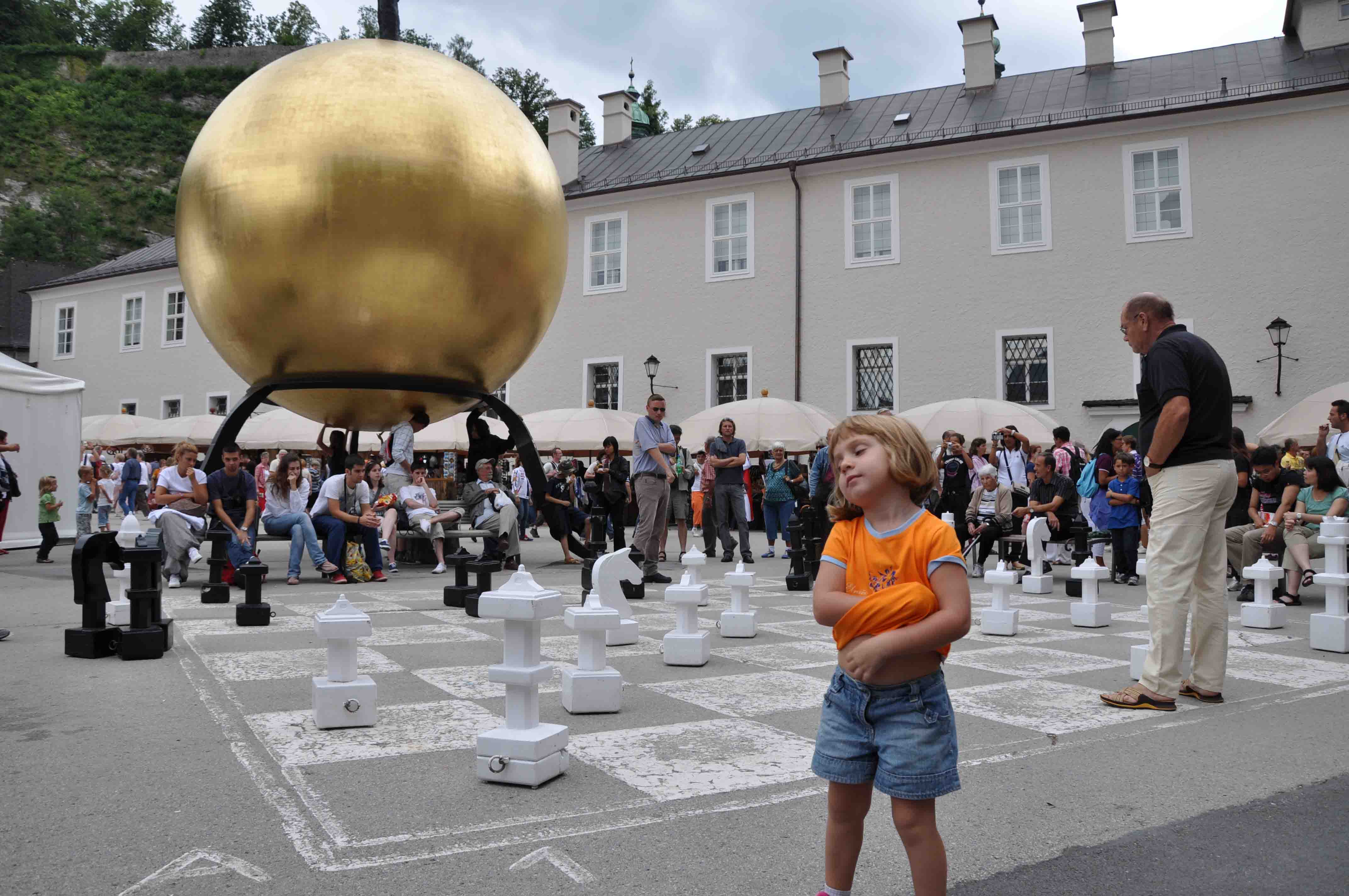 Seguimos paseando y llegamos al la plaza Mozartplatz donde tienen puesta una estatua del mismo Wolfgang Amadeus Mozart, junto a ella una bonita fuente. Si miras hacia arriba de la plaza verás una torre que cuenta con un Glockenspiel del siglo XVII, un histórico reloj musical que aún hoy repica tres veces al día. Nos unimos al resto de turistas e hicimos fotos del reloj con la montaña Mönchsberg al fondo. Al lado visitamos toda la zona de la Residenzplatz, una gran plaza pública en el centro del casco antiguo de Salzburgo. Los dos palacios de Residenzplatz son magníficos ejemplos de arquitectura barroca y renacentista, y la propia plaza en un importante lugar para la celebración de eventos culturales. Este plaza central de Salzburgo fue diseñada a finales del siglo XVI. Estaban preparando una gran cantidad de sillas porque por la noche había festival de música, y justo los soportales estaba situado un gigante ajedrez donde la gente de allí hacían sus partidas.
