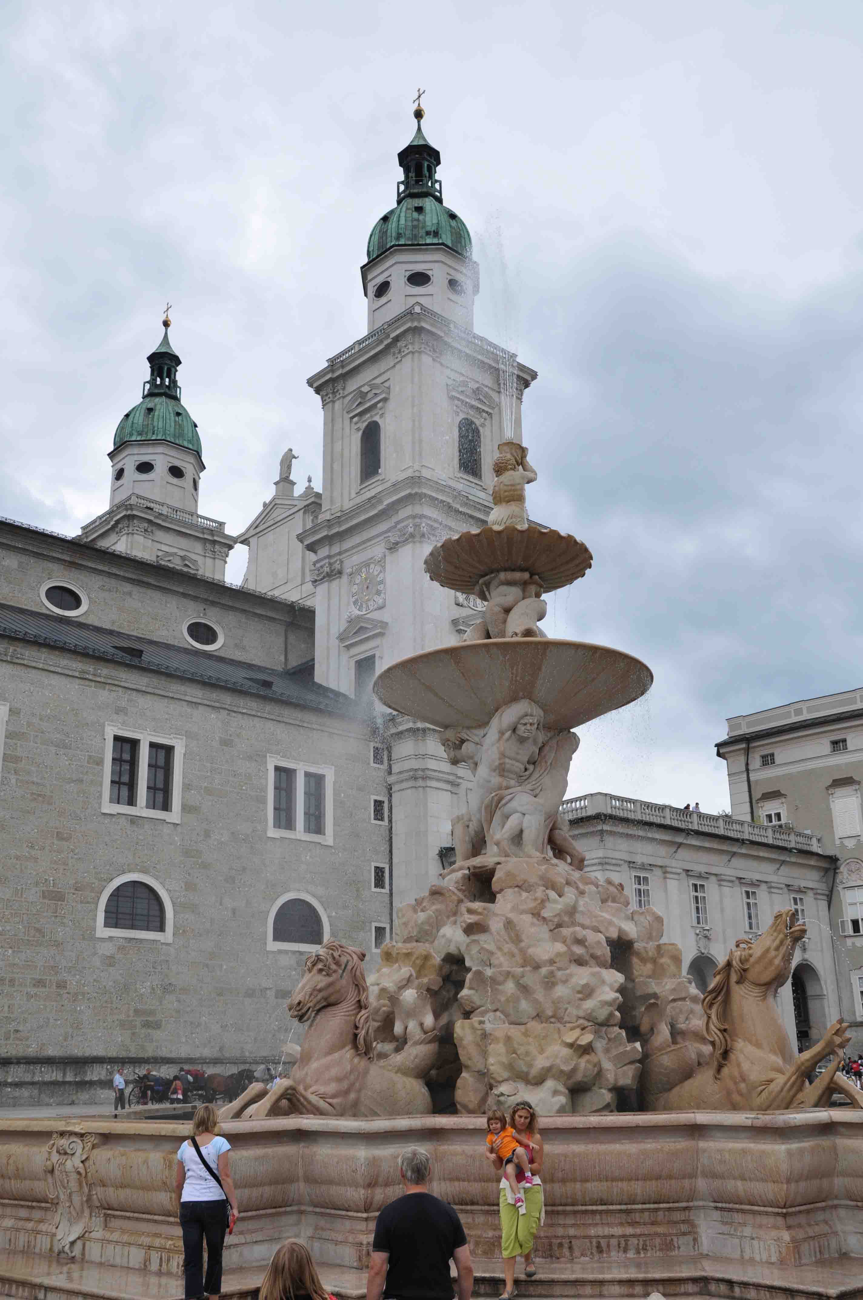 El punto fuerte de la plaza es la distinguida Residenzbrunnen (Fuente de la residencia). Esta es la fuente más grande de Salzburgo y podrás reconocerla como fondo en escenas de la película de 1965 Sonrisas y lágrimas. Las complejas esculturas de caballos, delfines y el atlas son obra del artista italiano Tomasso di Garone. Cada lado de la Residenzplatz es un punto de interés histórico de Salzburgo. En el lado oeste, encontramos la Residenz, un majestuoso palacio que data del siglo XIII.