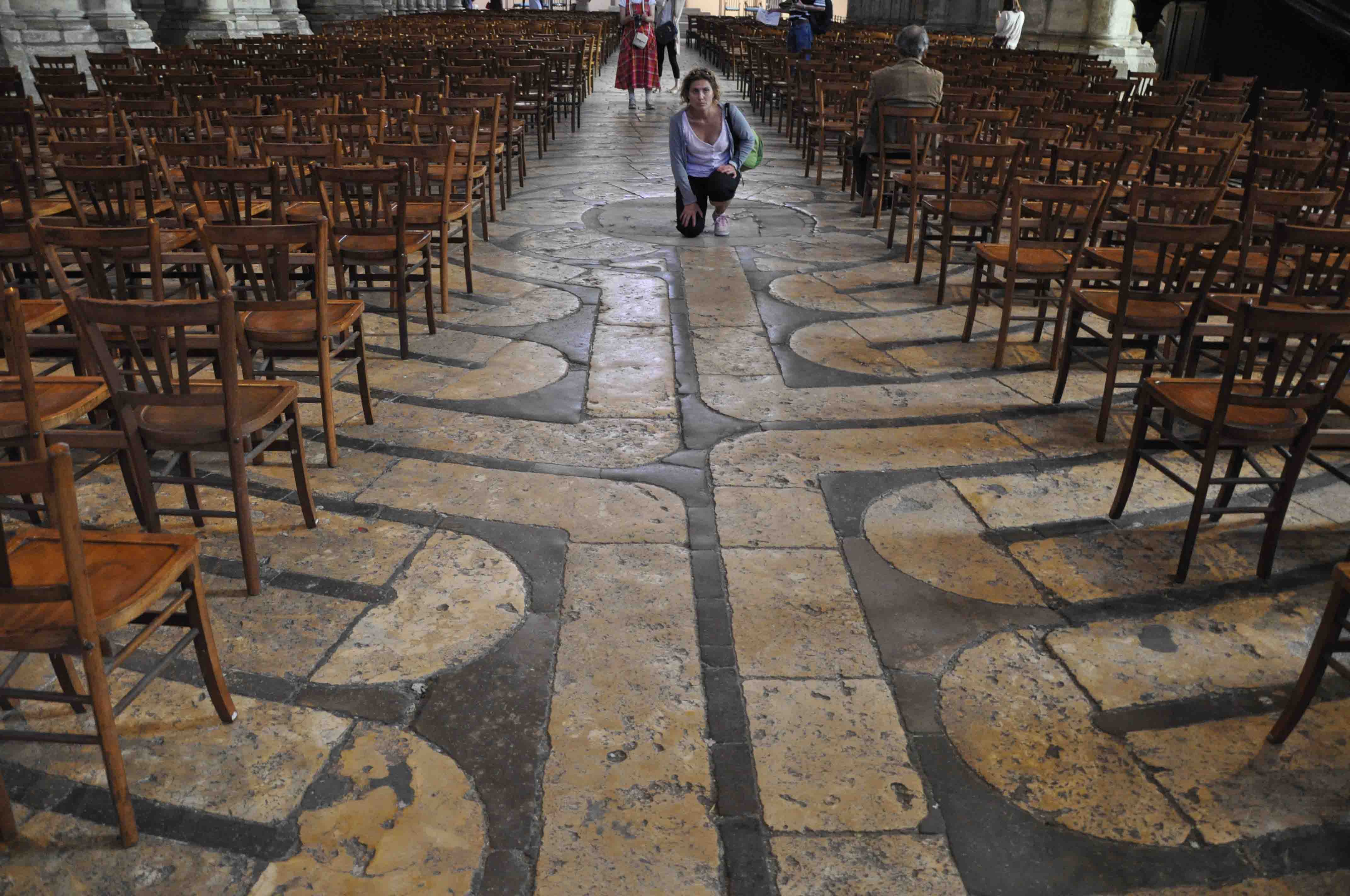 Nos llamó mucho la atención el laberinto cósmico, situado en el interior del edificio. Se trata de una composición de trece metros de diámetro grabado en la loza del la catedral, similar al que había en otras catedrales de la época, un enorme trabajo de incrustación de piedras claras y oscuras. En otras iglesias (por ejemplo, en Reims), semejantes laberintos llevaban los nombres de los arquitectos, como homenaje al genial arquitecto Dédalo, quien diseñó en la Antigüedad el laberinto de la corte del rey Minos. También en Chartres existía una placa de cobre, como demuestran los pernos que antaño la sujetaban. En ella, sin embargo, sólo apareció la lucha con el Minotauro. Y es que otro de los misterios de Chartres es que Sólo existen testimonios escritos sobre la construcción de la fachada occidental con las dos torres y el pórtico de entrada, todo ello erigido antes del incendio de 1194.