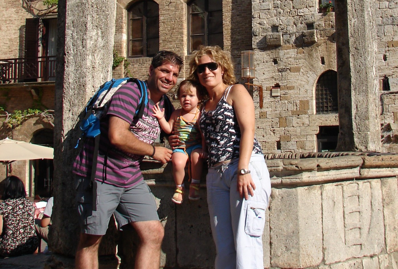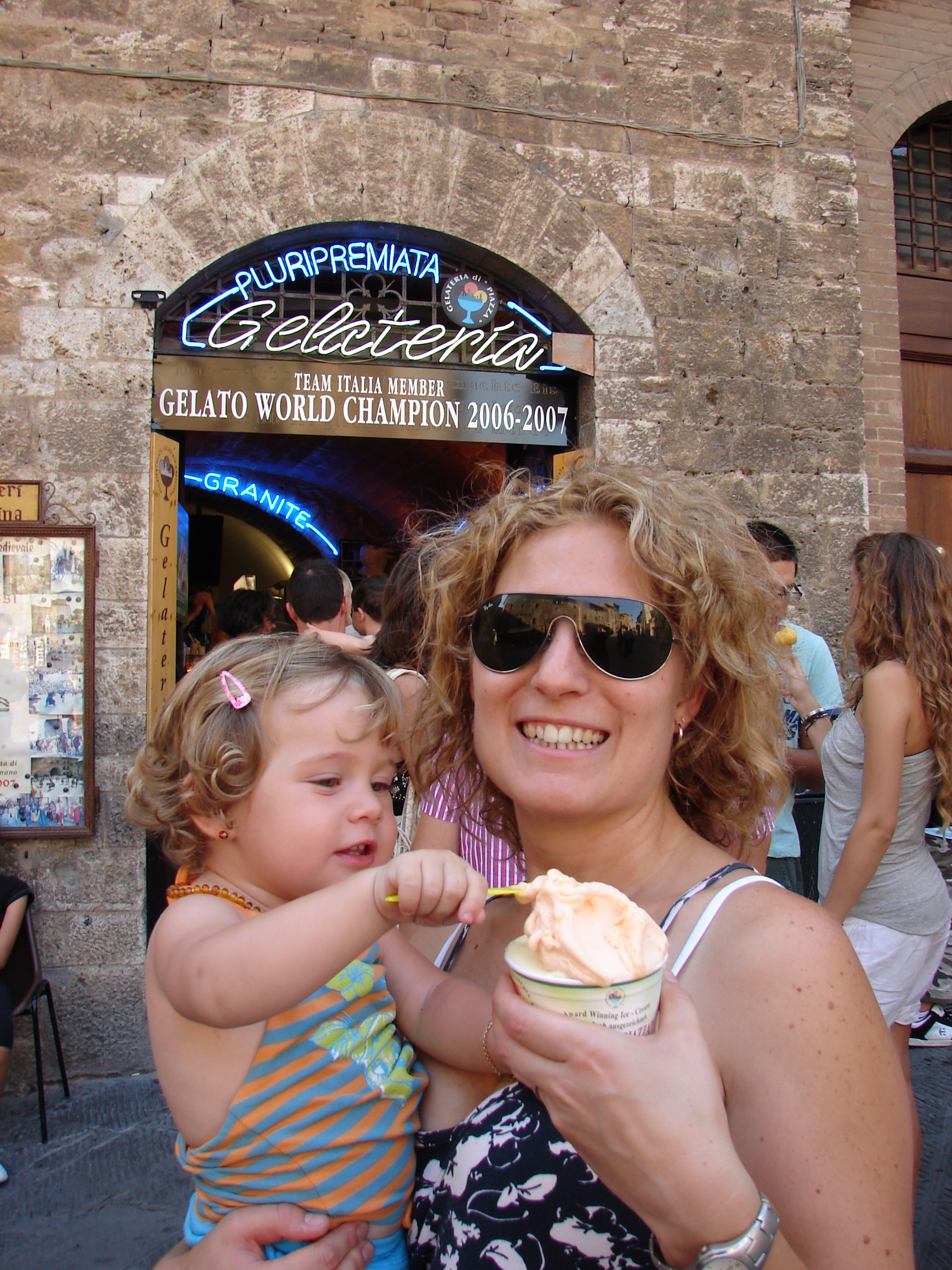 Nos pareció un pueblo especialmente bonito, eso sí, muy masificado por el turismo, pero sin perder su encanto. Tras adentrarnos un poco más en el centro antiguo, pasamos bajo el Arco dei Becci, y llegamos al centro de la ciudad, la Piazza della Cisterna, que recibe su nombre debido al pozo que hay en el centro, en el que la gente echa monedas y está rodeada por restaurantes y terrazas. Para quienes disfruten de los helados, les aconsejamos no dejar de visitar la famosa Gelateria della Piazza, premiada en numerosas ocasiones por la calidad de sus helados. No dejamos la oportunidad de probarlos y reconocer que está justamente premiada, uhhmmmm!!!… que buenos que estaban.