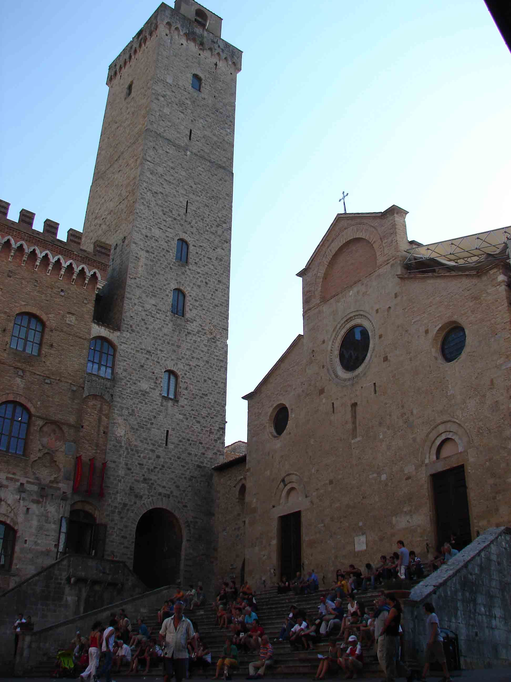 Entre la Piazza de la Cisterna y la Piazza del Duomo tuvimos que pasar debajo de unos arcos que corresponden a una logia (Loggia del Comune) donde se reunía el pueblo en la época medieval. Ya en la Piazza del Duomo había un concierto de un coro musical. Nos sentamos en las escaleras a descansar un poco mientras mirábamos el espectáculo. Allí no se halla la catedral si no que tenemos la Collegiata, de estilo románico a la que se accede subiendo por unas escalerillas, de fachada de ladrillo y con unos frescos de Domenico Ghirlandaio, del S.XV. del suelo hasta el techo, ilustraciones del Nuevo y Antiguo Testamento. En la capilla de Santa Fina es un fresco del siglo XV mostrando las torres de San Gimignano, como eran en aquella época. Frente al Duomo también está la Torre Rognosa, de 50 metros de altura y una de las más antiguas torres.