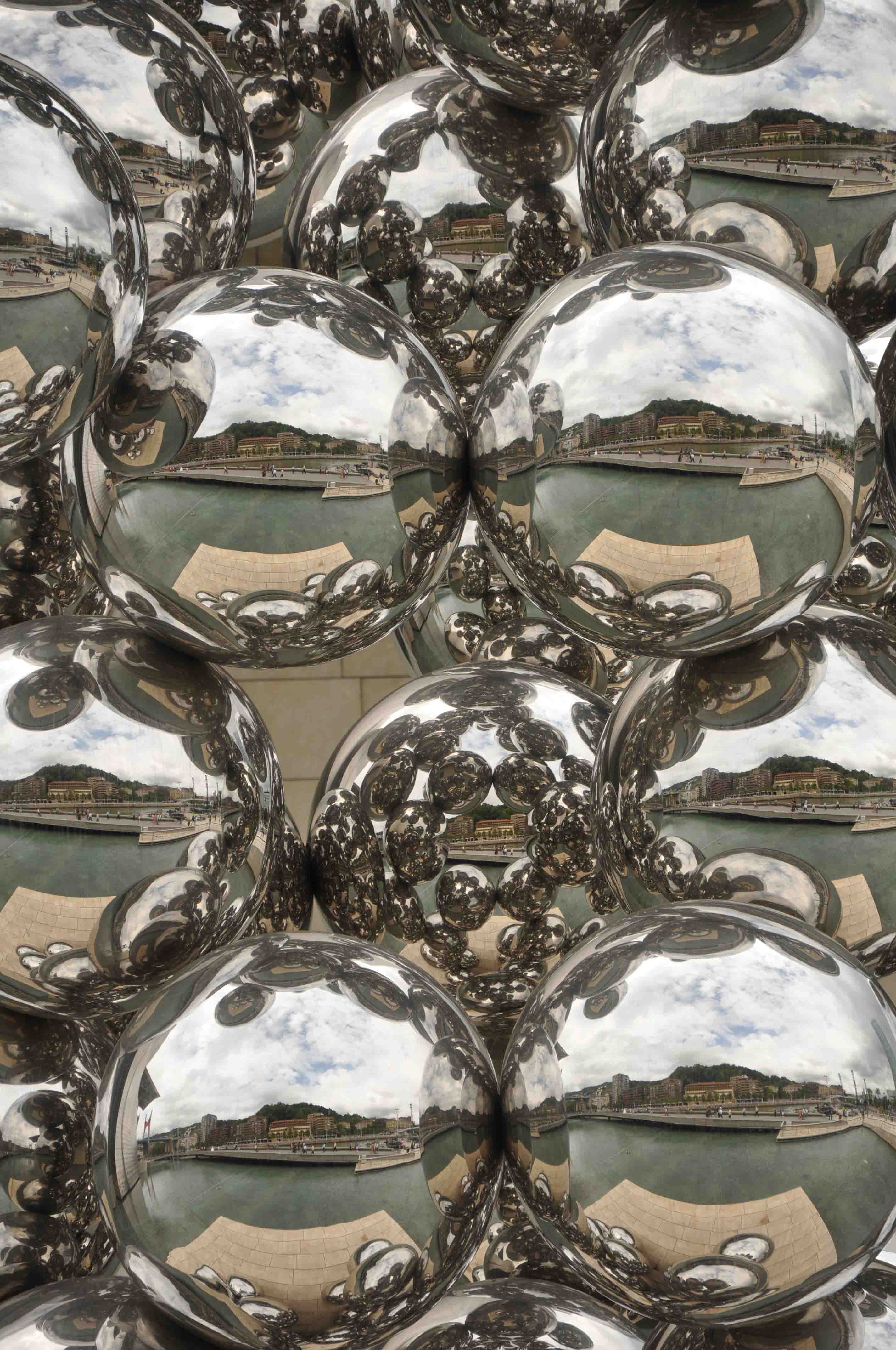 Por último antes de dirigirnos al parque adyacente nos detuvimos en otra curiosa escultura formado por unas bolas plateadas,  la monumental obra de Kapoor El gran árbol y el ojo, consta de setenta y tres esferas reflectantes asentadas sobre tres ejes. Las superficies de las esferas se reflejan y refractan entre sí, creando y disolviendo simultáneamente la forma y el espacio.