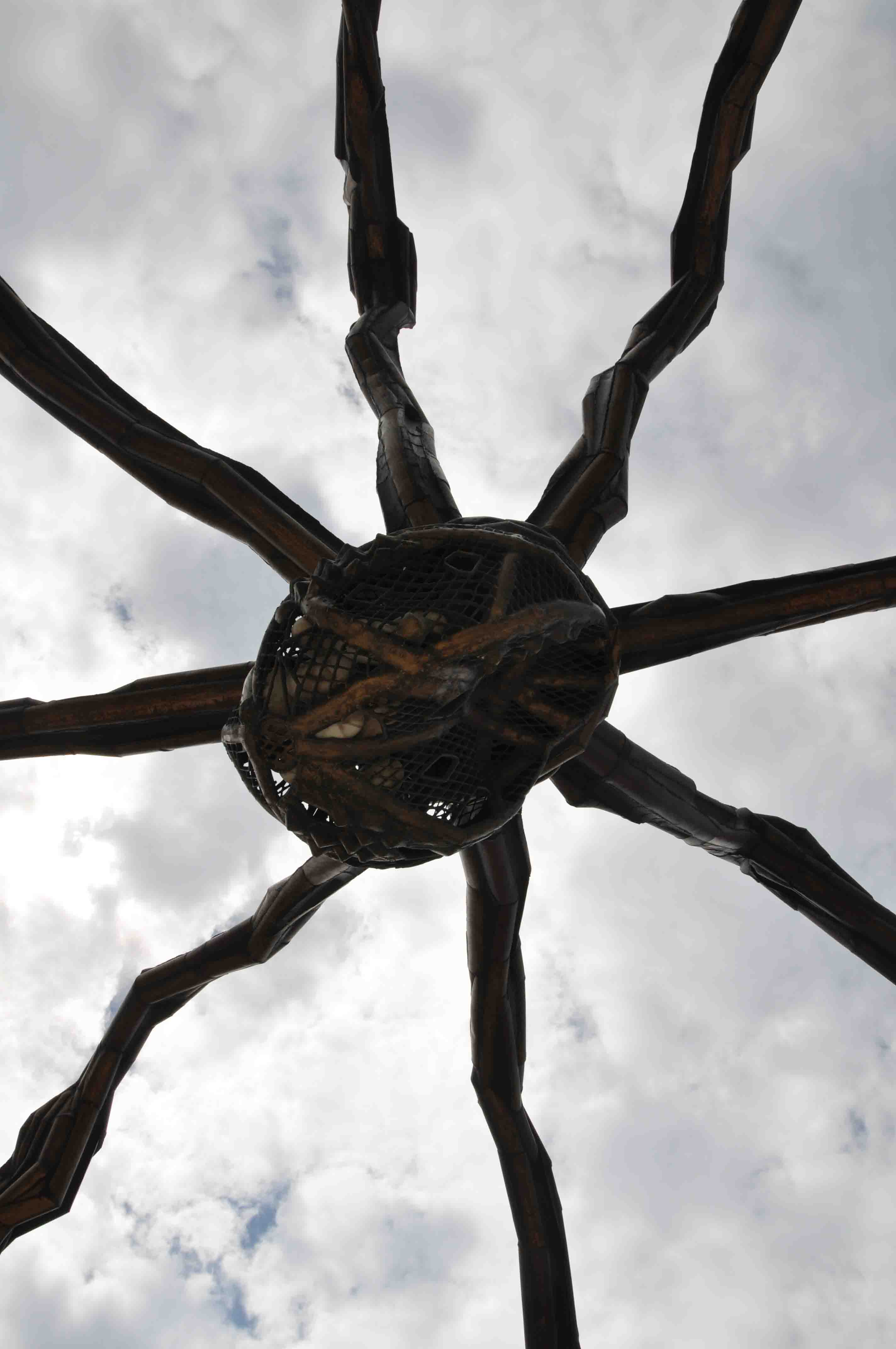 Dimos la vuelta al museo y llegamos a una impresionante figura. Mamá (Maman), de casi 9 metros de altura, es una de las esculturas más ambiciosas de Bourgeois y pertenece a una serie inspirada en la araña. Las arañas, que Bourgeois presenta como un homenaje a su madre, que era tejedora, ponen de manifiesto la duplicidad de la naturaleza de la maternidad: la madre es protectora y depredadora al mismo tiempo. Estas ambigüedades se ven intensamente reflejadas en esta Mamá gigantesca, que se sostiene ominosamente sobre unas patas que semejan arcos góticos y que funcionan al mismo tiempo como jaula y como guarida protectora de una bolsa llena de huevos que se encuentran peligrosamente adheridos a su abdomen. La araña provoca pavor y miedo pero su gran altura, sorprendentemente equilibrada sobre unas ligeras patas, transmite una vulnerabilidad casi conmovedora.