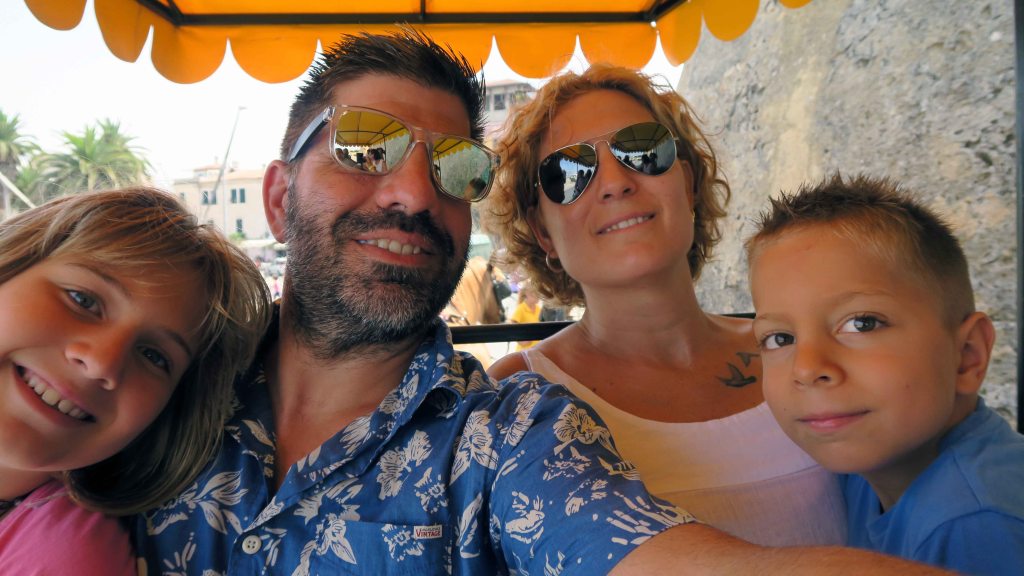 Llegamos al pie de la muralla y para tener una primera toma del casco antiguo, teníamos dos opciones. La primera era un tren turístico llamado el trenino catalano y la segunda era un paseo en carromato tirado por un caballo donde un audioguia en catalán, nos explicaba la historia de la ciudad. Al final, los niños eligieron la segunda opción.