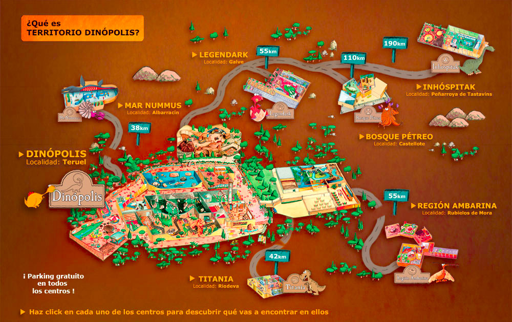 - Territorio Dinópolis esta formado por siete museos ubicados en los alrededores de Teruel: Inhóspitak en Peñarroya de Tastavins; Legendark, en Galve; Bosque Petreo en Castellote; la Región Ambarina, en Rubielos de Mora; Valcaria en Ariño; Titania en Riodeva y Mar Nummus en Albarracín.. Ademas del mismo parque Dinópolis en Teruel.