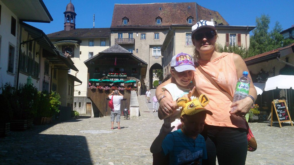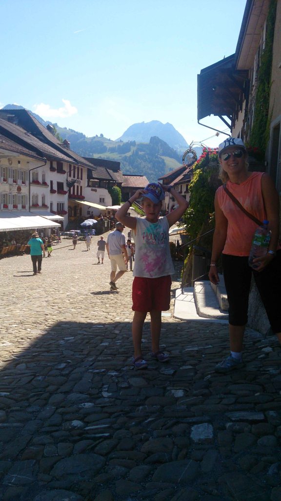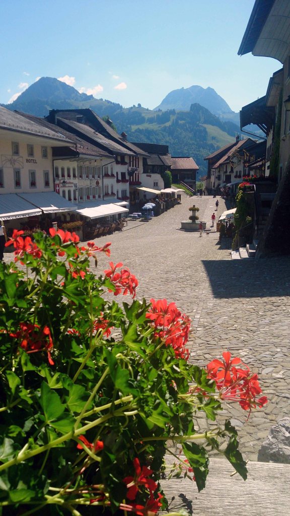 Dejamos el coche en el parking al pie de la colina y empezamos a andar cuesta arriba las escaleras que nos llevarán hasta el pueblo de Gruyères. Entramos en el pueblo y enseguida nos encontramos con la plaza principal, con una bonita fuente en medio y tiendas alrededor, decorados con geranios de colores y cencerros en los marcos de las puertas.