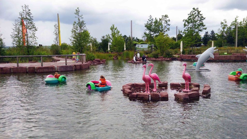Un rato después llegamos a otra zona de agua, el pequeño Estanque Power Paddler, donde los peques pudieron subirse en una pequeñas barcas y llevarlas con pedales manejados con las manos. La seguridad es lo primero y les pusieron chalecos salvavidas. Todo esto, con ambientación de figuras de agua, compuertas y fuentes.