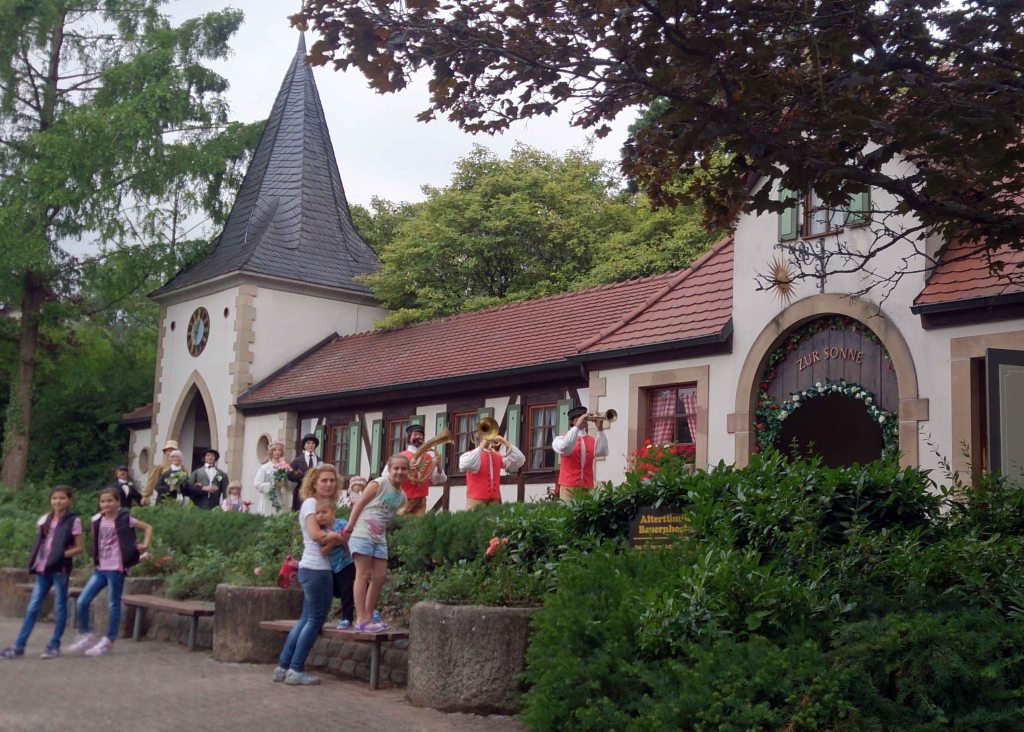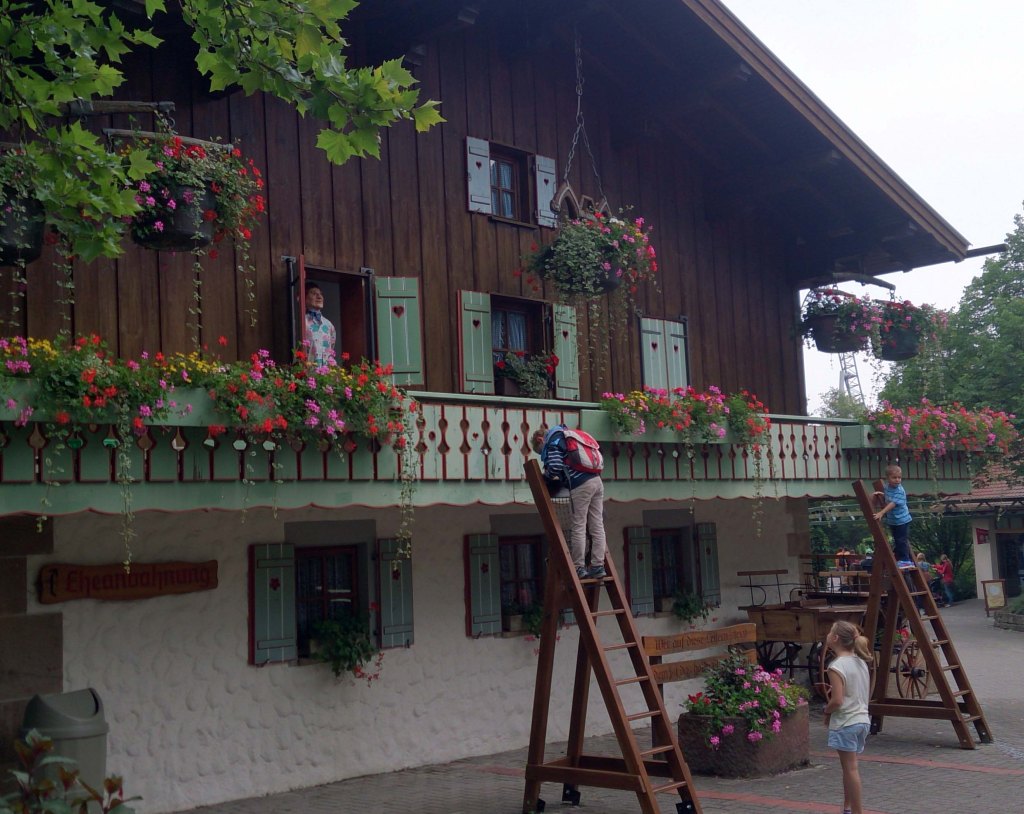 Continuamos nuestro recorrido, caminando entre jardines de flores, teatros ambulantes, orquestas que sin más, empezaban a tocar. Subimos a una escalera a cortejar a una dama en su balcón, Fensterln, nos asomamos a un pozo rodeado de flores,… y así un montón de atracciones muy diferentes.