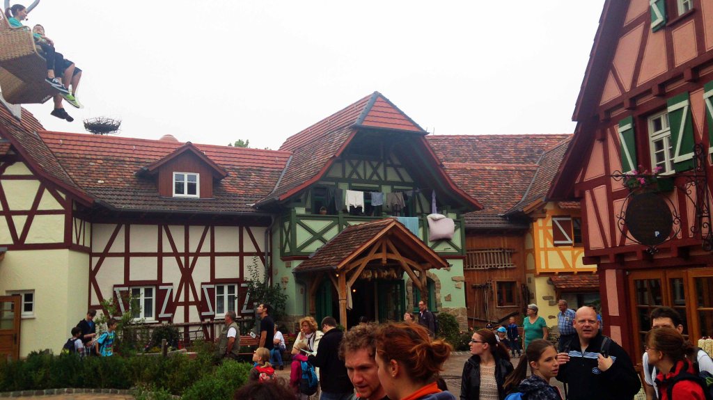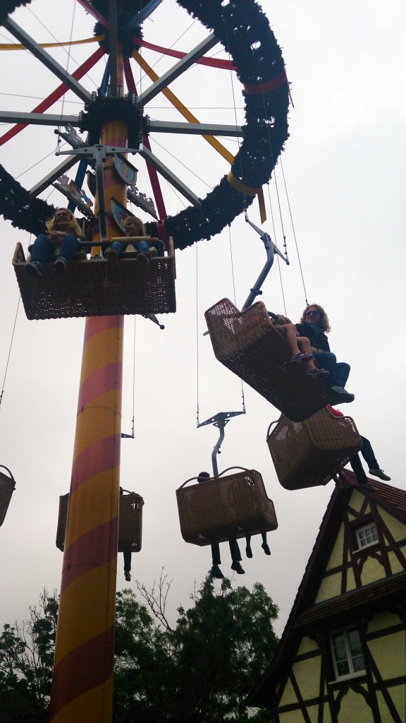 Nada mas entran encontramos las típicas casas de entramado de madera que te invitaban a pasear. Al lado encontramos algunas atracciones familiares. La que probamos nosotros fue la del árbol de mayo, montados en cestas.