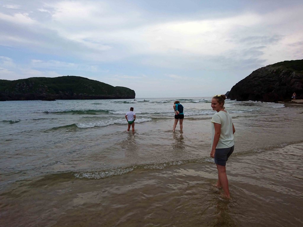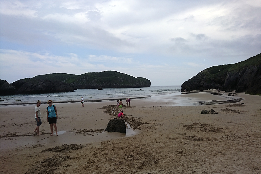 Estaba nublado pero ya había bastante gente en la playa. Los peques no tardaron nada en meterse al agua, un agua que no estaba tan fría como cuando fuimos a la playa de Gulpiyuri.
