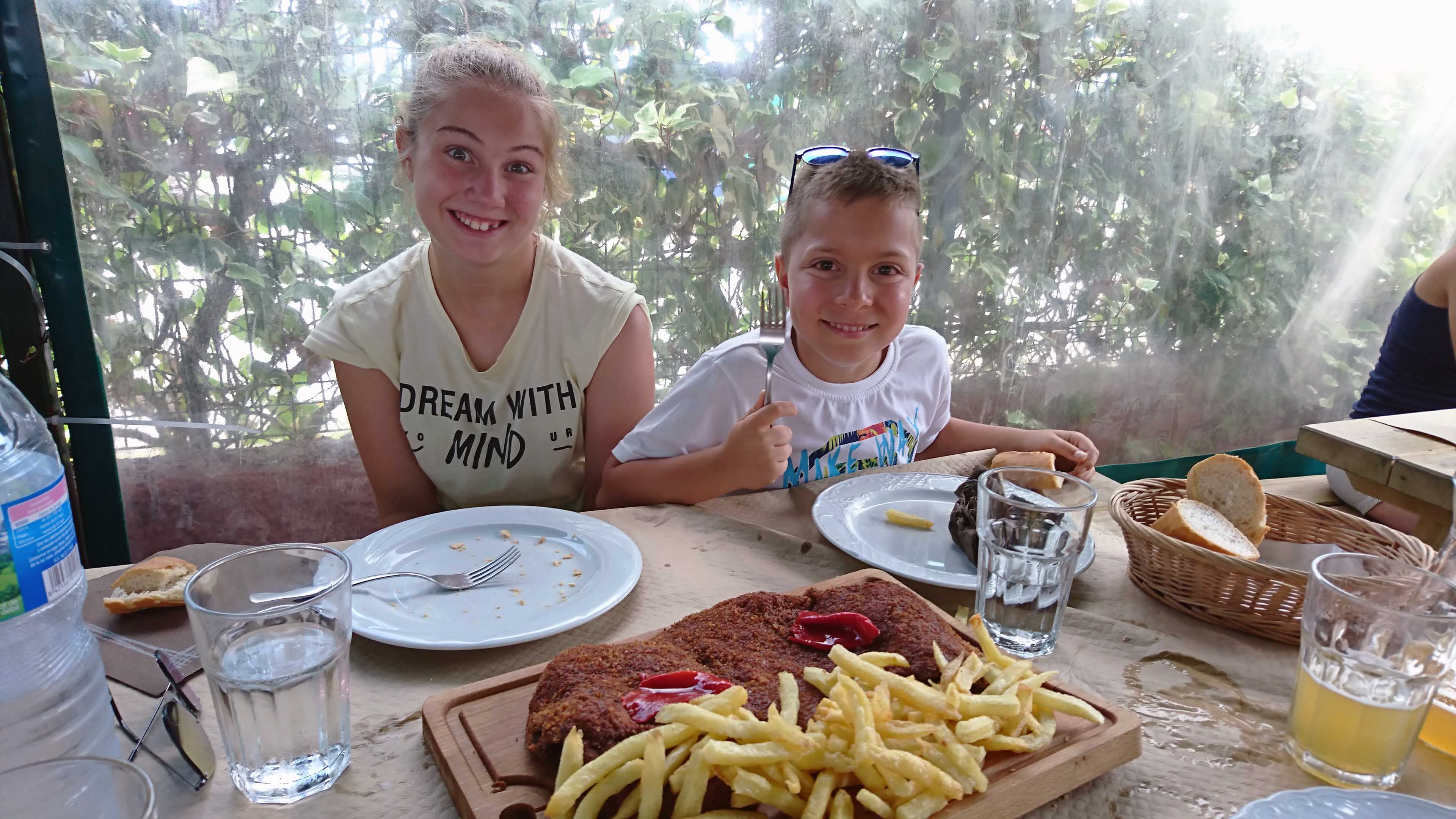 Después del baño, nos dirigimos al restaurante del Camping María Elena. ¨Si queréis comer bien y a buen precio, tenéis que ir allí¨, con estas palabras nos lo habían aconsejado. Tenían razón, pedimos una bandeja de calamares y un cachopo para los cuatro. Y vaya pedazo de cachopo!!!