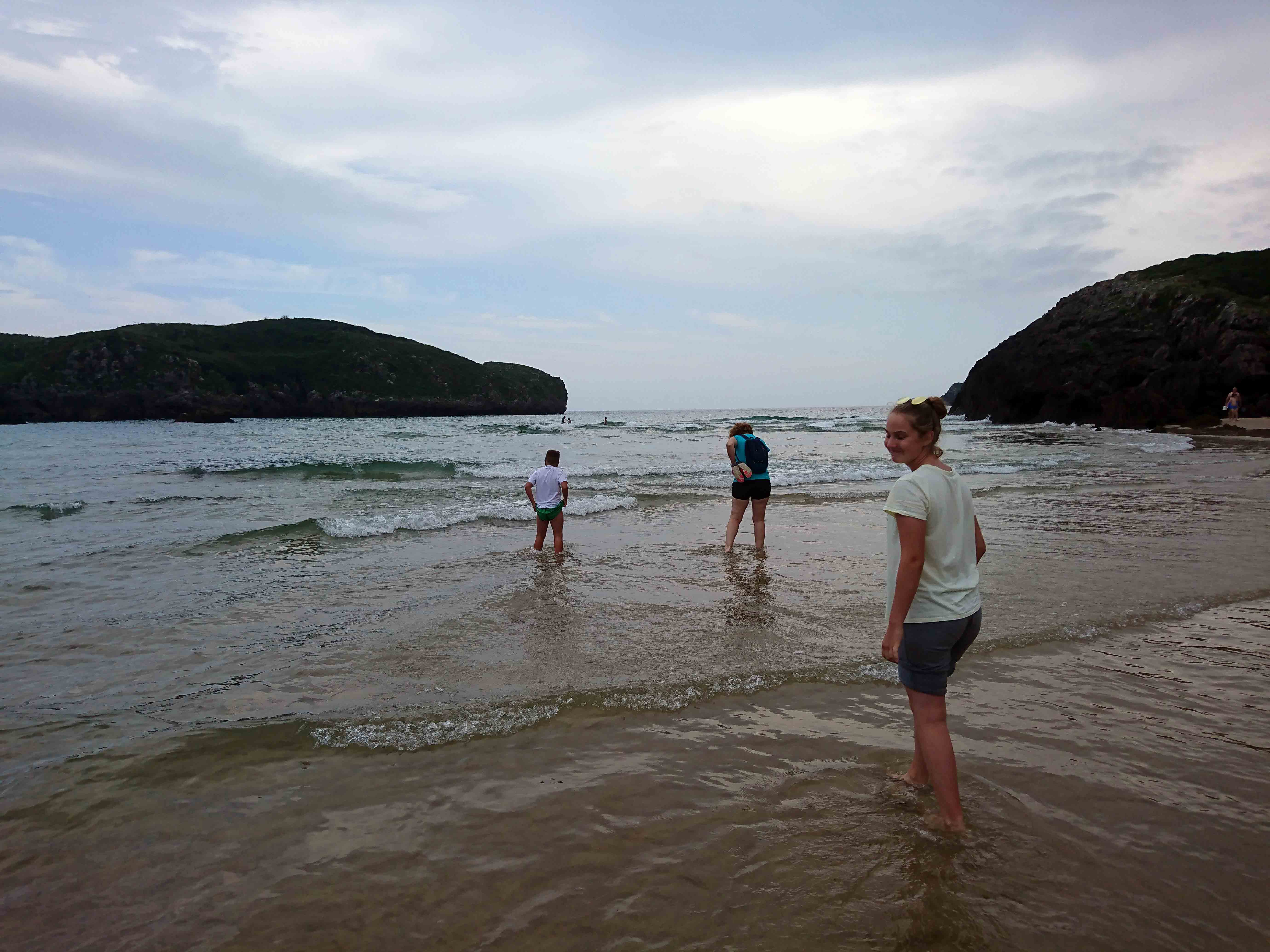 Estaba nublado pero ya había bastante gente en la playa. Los peques no tardaron nada en meterse al agua, un agua que no estaba tan fría como cuando fuimos a la playa de Gulpiyuri.