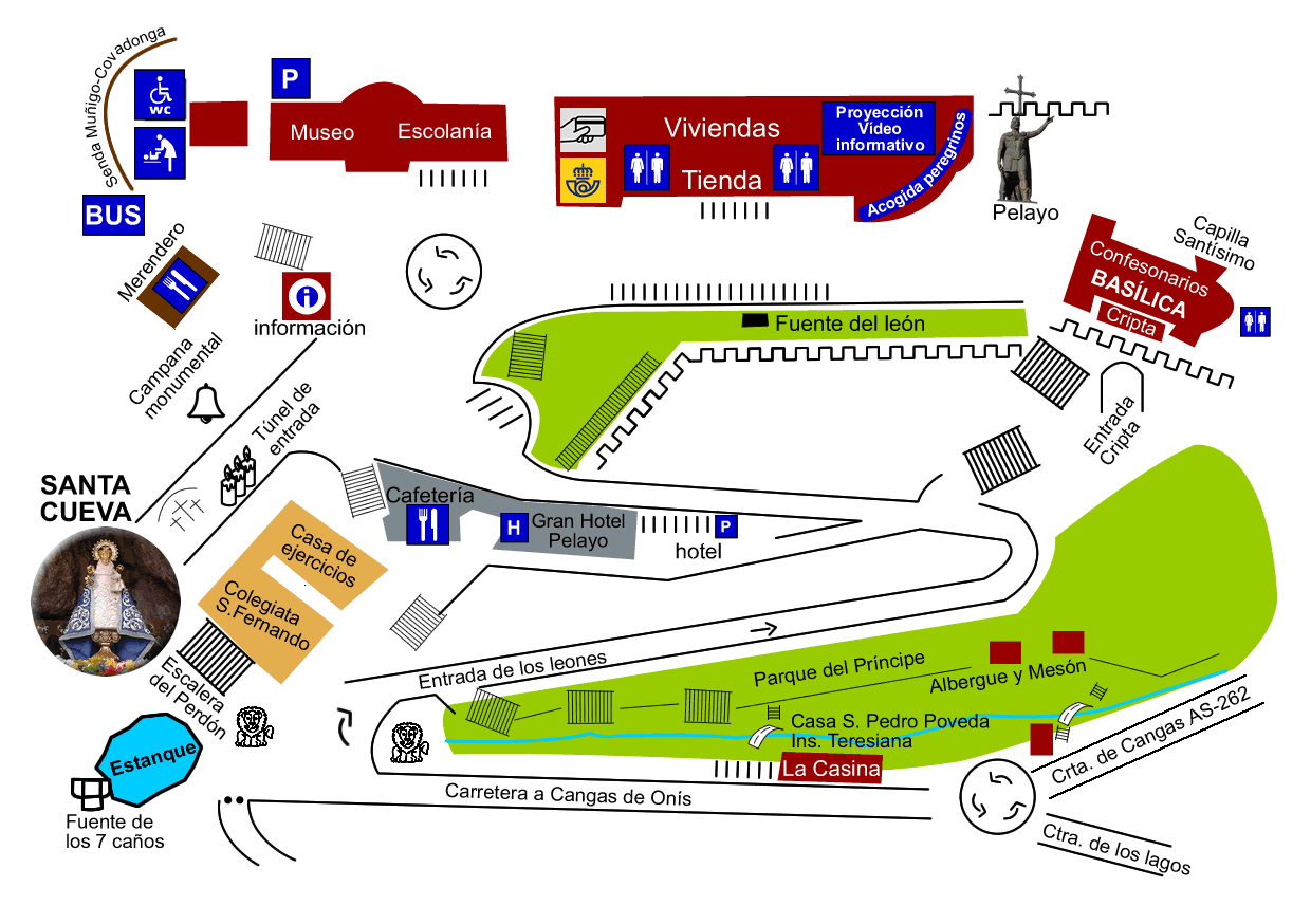 En el complejo, además de estas dos atracciones, podemos encontrar algunos edificios eclesiásticos y diversos establecimientos hosteleros. Sus orígenes están unidos a laBatalla de Covadonga, supuso el comienzo de la independencia asturiana, que luego cuajaría en el proceso de reconquista por parte de Don Pelayo.