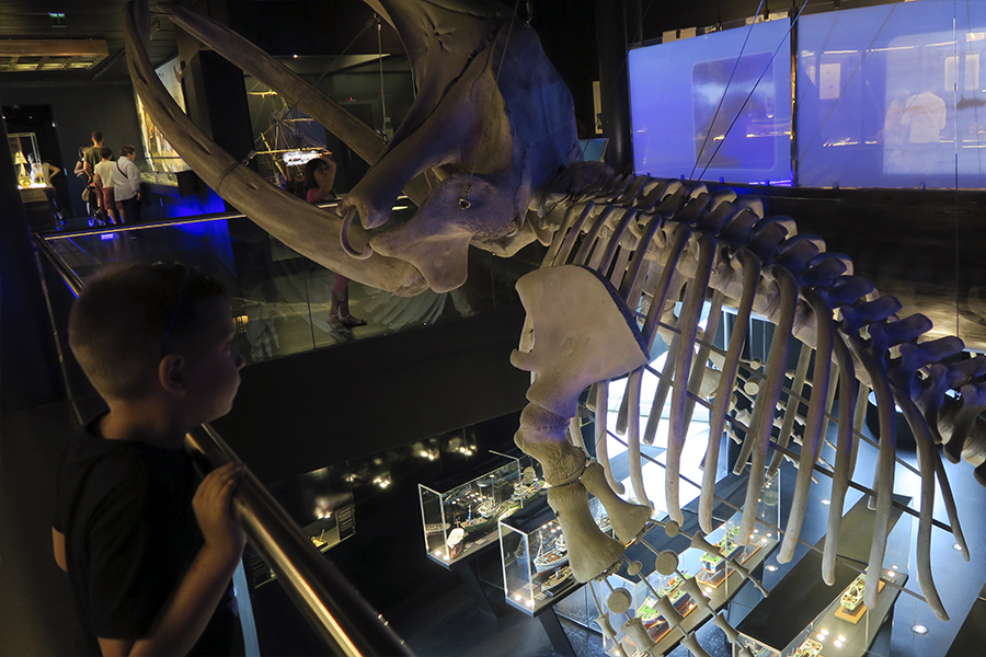 El Aquarium está dividido en dos espacios bien diferenciados. Lo primero que vimos al entrar fue el esqueleto de una ballena franca de 11 metros de largo que colgaba del techo. La ballena se capturó en el Cantábrico en 1870 por arponeros de la zona.