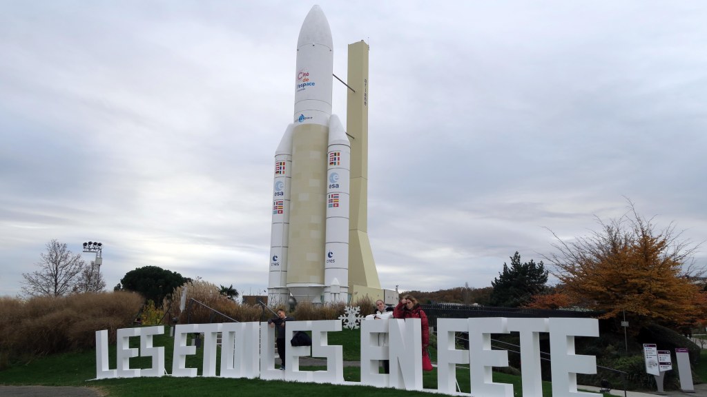 Dentro, lo primero que vemos al salir del edificio de entrada, es un cohete Ariane 5 en el centro del parque con sus 53 metros de altura. Impresiona ver semejante cohete, rodeado de edificios y otras atracciones.