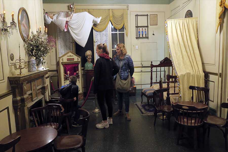 Otra de las zonas simula el interior de una casa encantada, decorada en estilo señorial donde podemos encontrar, una señora en el aire.