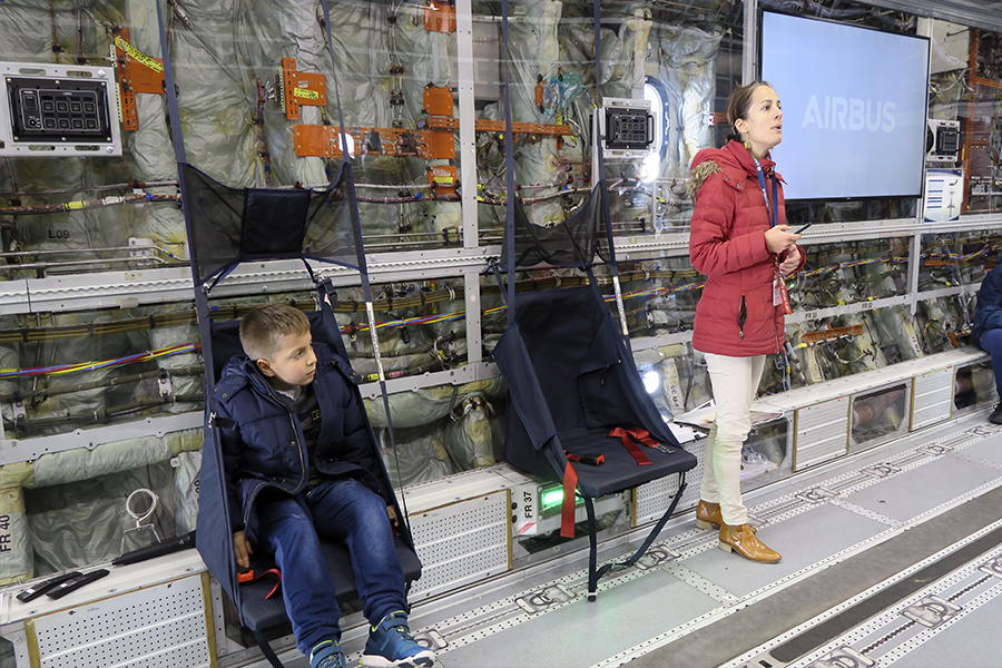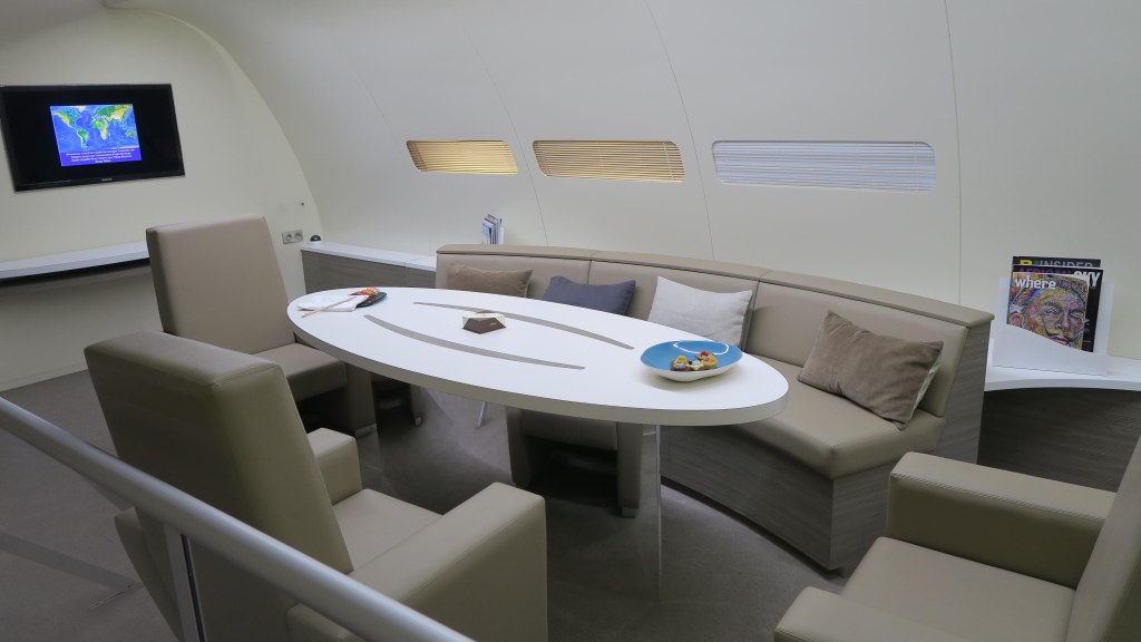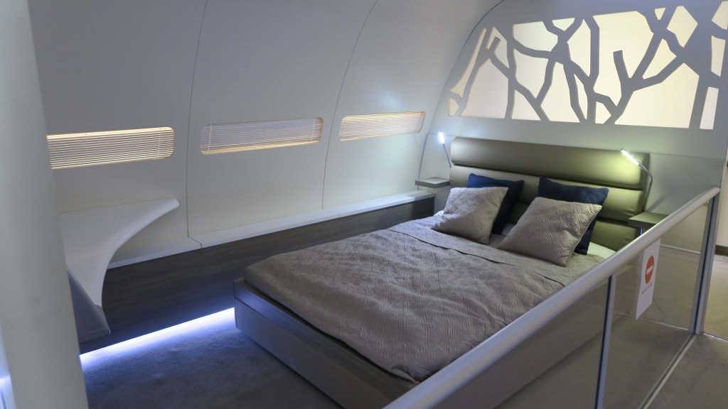 Continuamos visitando el Airbus A300B, donde han cambiado las placas del techo, paredes y suelo por placas transparentes. Pudimos ver todo el cableado interior y justo después una habitación con una gran cama y hasta una sala de reuniones, todo decorado como un avión de gran standing.