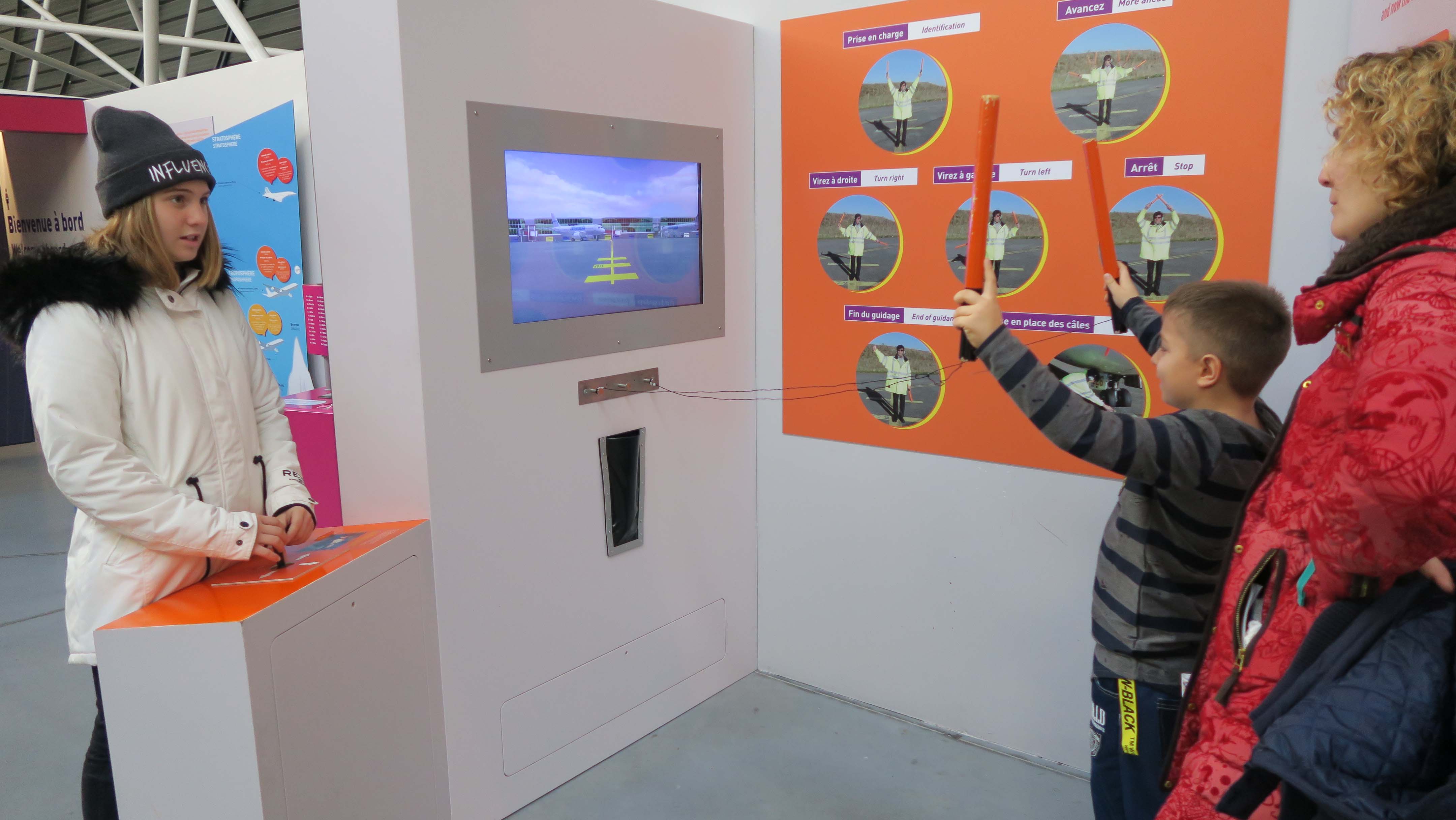 Junto a la exhibición, pudimos ver una serie de paneles, maquetas y vídeos, donde nos explican la historia de la aviación francesa. Además juegos interactivos nos enseñan como diseñar un avión, como señalizar la conducción del avión por la pista o un simulador de vuelo, para pasar el avión por dentro de los círculos.