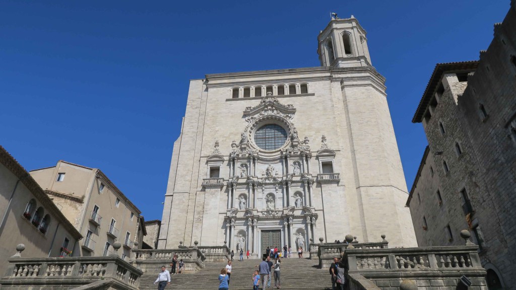 La calle nos llevó a los pies de la gran escalinata de la Catedral de Girona. De estilo románico y gótico, se construyó entre los siglos XI y XVIII. Cuenta con la nave gótica más amplia de Europa y la segunda más ancha del mundo, tras la Basílica de San Pedro del Vaticano.
