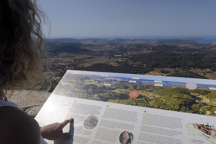 Nos acercamos a los miradores para observar el horizonte. El día era claro y pudimos distinguir muchas atracciones de la isla. Además, existen paneles informativos donde nos detallan las vistas. Pudimos distinguir la bahía de Fornells, el faro de Artrutx o la playa de Son Bou, entre otros puntos de interés.