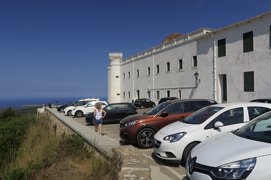 Tras dejar atrás el pueblo de Es Mercadal, empiezan las rampas y curvas que vamos sorteando en nuestro coche hasta llegar, a la cima del Monte Toro. Dejamos el coche en el estacionamiento y salimos para admirar las vistas.