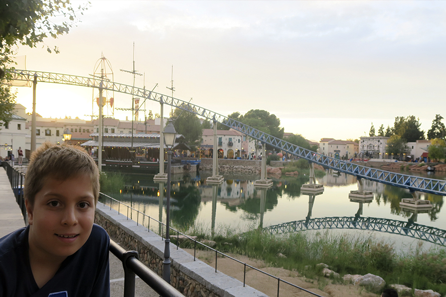 Después de pasar los tornos de entrada, empezamos a ver toda la ambientación de Halloween, con muchas arañas por las paredes de las casas y en el centro de la plaza, Woody rodeado de un montón de calabazas. Pasamos las casas y entramos al lago del área de la Mediterránea.
