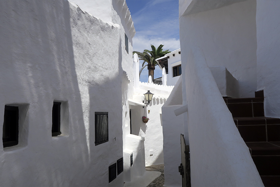Dejamos el coche aparcado muy cerca del pueblo, en una pequeña urbanización. Nos acercamos paseando y bajando una calle, a lo lejos, empezamos a divisar las primeras casitas blancas. Construido entre 1964 y 1968 por el aparejador menorquín Antonio Sintes y el arquitecto barcelonés Javier Barba Corsini, la idea inicial era recrear un poblado que llamase la atención de intelectuales, pintores y escritores que pudieran disponer de un entorno único para inspirarse, hoy en día se encuentra completamente restaurado. Entramos en el pueblo y observamos las casas construidas a modo de complejo turístico.