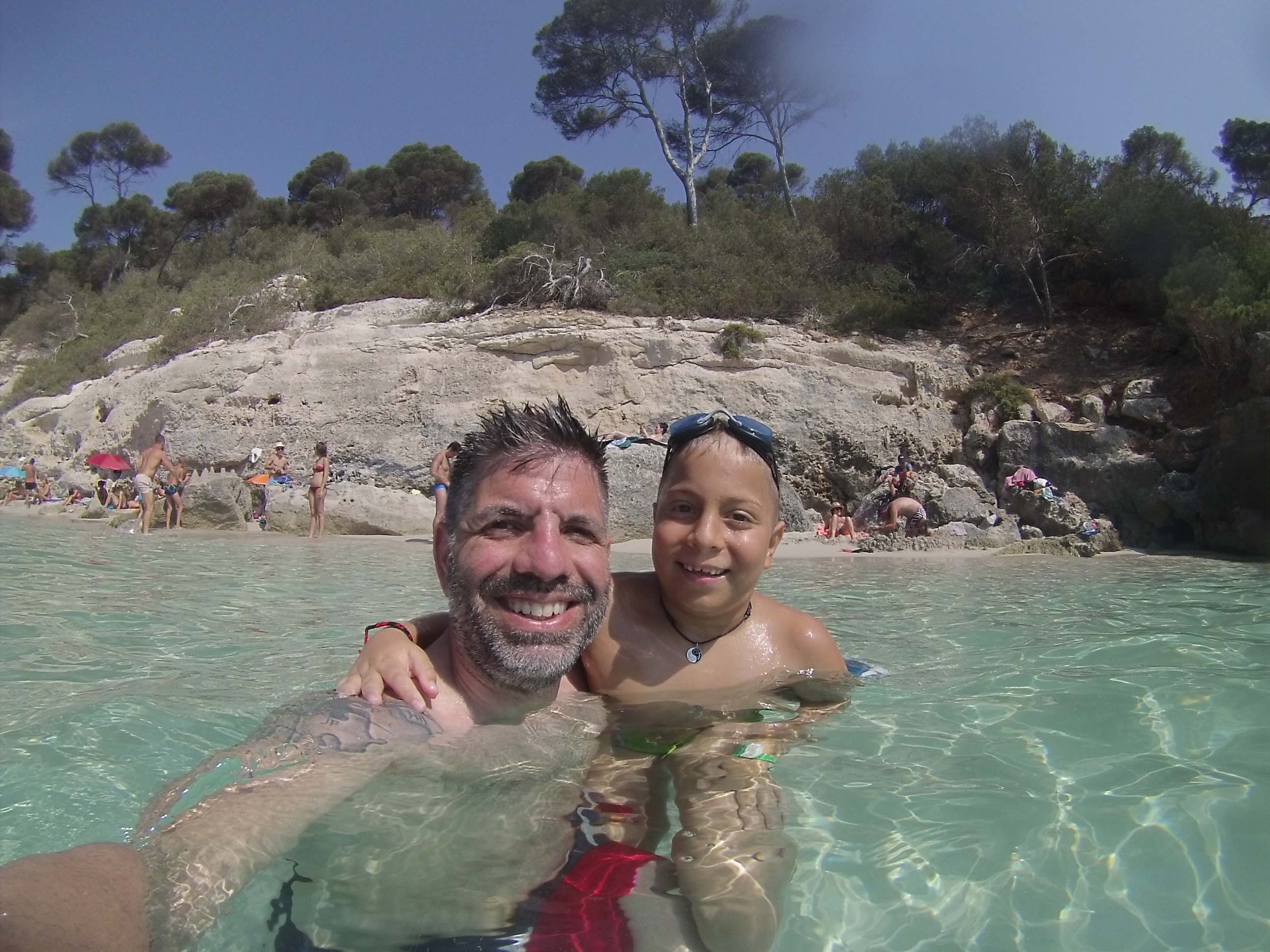 Ya en el agua, mientras hacíamos snorkel, nos dirigimos hacía nuestra derecha para visitar la hermana pequeña de la Cala Mitjana, la Cala Mitjaneta. En muy poco tiempo nadando (y en muchas partes del recorrido tocando pie), llegamos a la cala. Más resguardada del viento, la encontramos más limpia y serena. Apreciamos que se trataba de una minúscula cala sin apenas arena donde apenas podían caber dos o tres sombrillas, a veces, según la marea, ni eso.