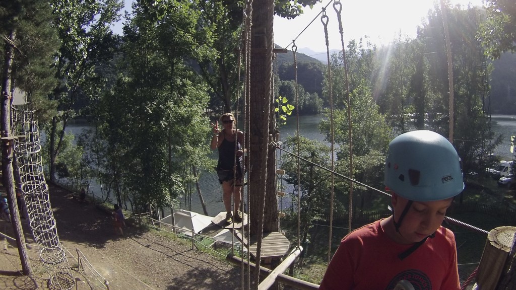 Por la tarde, teníamos programado el primer bosque vertical del Pallars, con circuitos para todas las edades. 5 circuitos de aventura por los árboles diferenciados por colores (verde, naranja, azul, rojo) según las edades, alturas y niveles de los participantes. Nosotros elegimos 2 de ellos, el azul y el rojo.