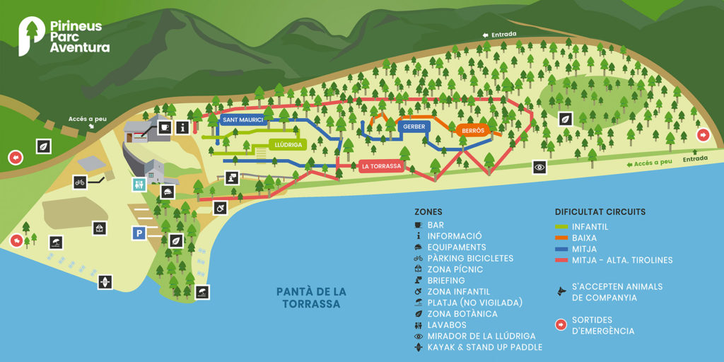 Nuestra próxima actividad tuvo lugar en este bello paraje. El nombre de la Torrassa procede de la antigua torre de vigilancia que existía en este lugar. Cruzamos la presa y nos dirigimos al Pirineus Parc Aventura, una empresa que se dedicaba a realizar circuitos de aventura en los árboles, kayak, circuito botánico, Stand Up Paddle, playas de montaña … Allí teníamos contratado dos actividades, una por la mañana y otra por la tarde.